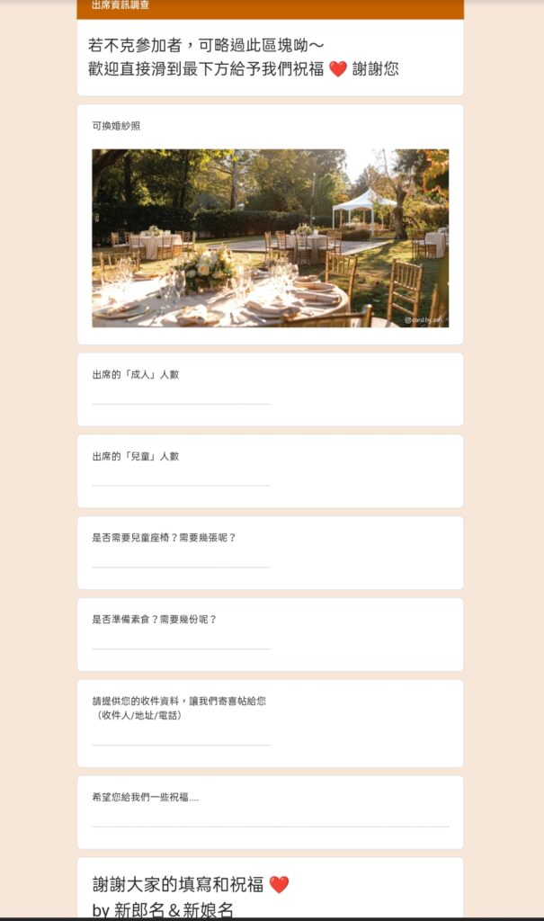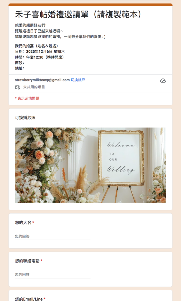 由於最近陸續有新人,來詢問禾子是否有婚禮統計表, 我們原先一直很苦惱因為如果是由我們創建表單,這樣登入者是我們, 新人的來賓填寫完表單,反而回覆會全部都跑到我們這邊來。 所幸研究一陣子後,終於找到了怎麼做成範本給大家使用囉!那我們開始吧!